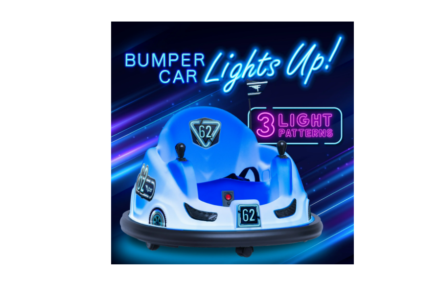 Ce véhicule électrique est alimenté par une batterie 6V intégrée et est fourni avec un chargeur mural 120V. La batterie est rechargeable. Elle vous assure ainsi de nombreuses heures de jeu à mesure que votre enfant grandit. Cette voiture tamponneuse électrique pour enfants effectue des virages à 360°. Elle est équipée de lumières LED clignotantes et atteint une vitesse maximale de 1,6 km/h.
